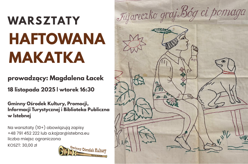 Zapraszamy serdecznie do Gminnego Ośrodka Kultury w Istebnej na wyjątkowe spotkanie z tradycją i rękodziełem! Już we wtorek, 18 listopada o godz. 16:30 wspólnie stworzymy piękne, haftowane makatki.