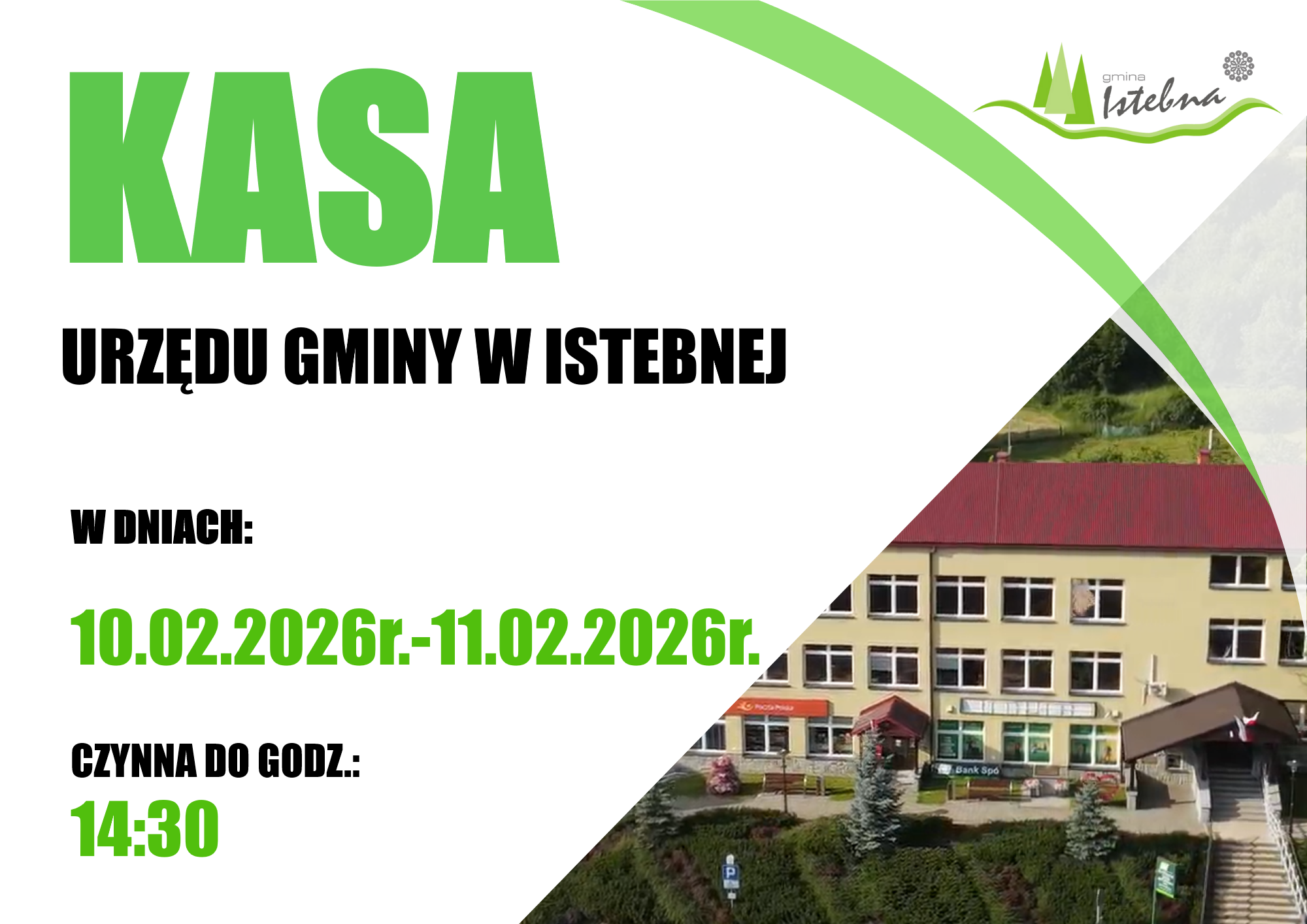 Uprzejmie informujemy, że KASA Urzędu Gminy w Istebnej w dniach 10.02.2026r.-11.02.2026r. będzie czynna do godz. 14.30