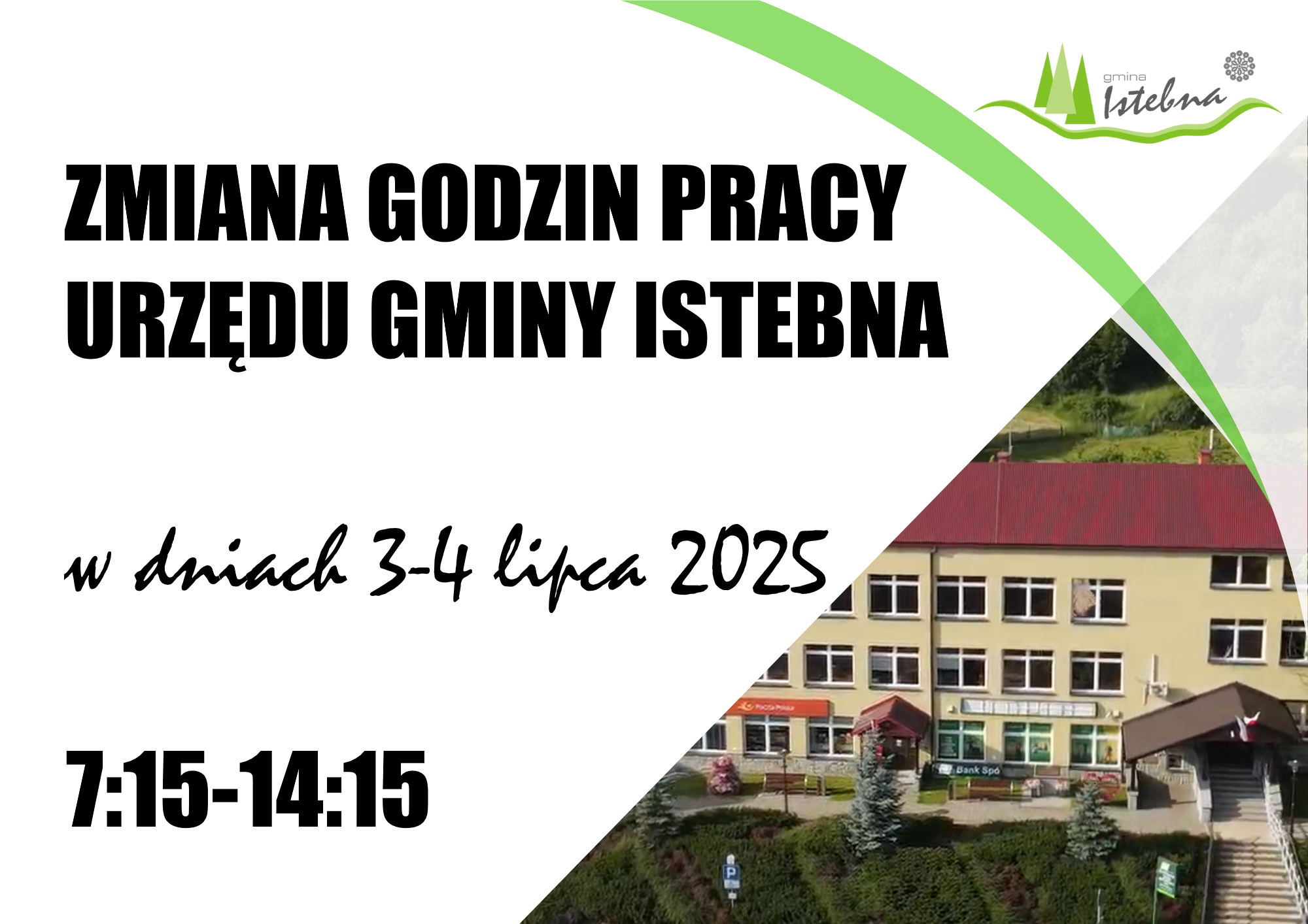 Informujemy, że w dniach 3-4 lipca 2025 r. Urząd Gminy Istebna będzie czynny w godzinach od 7:15 do 14:15.
