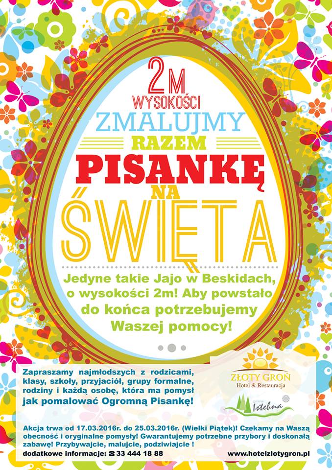 CODZIENNIE OD 17 DO 25 MARCA 2016 ROKU W HOTELU ZŁOTY GROŃ W ISTEBNEJ NA OGROMNEJ 2 METROWEJ PISANCE BĘDZIE MOŻNA „MALOWAĆ” WŁASNE POMYSŁY!