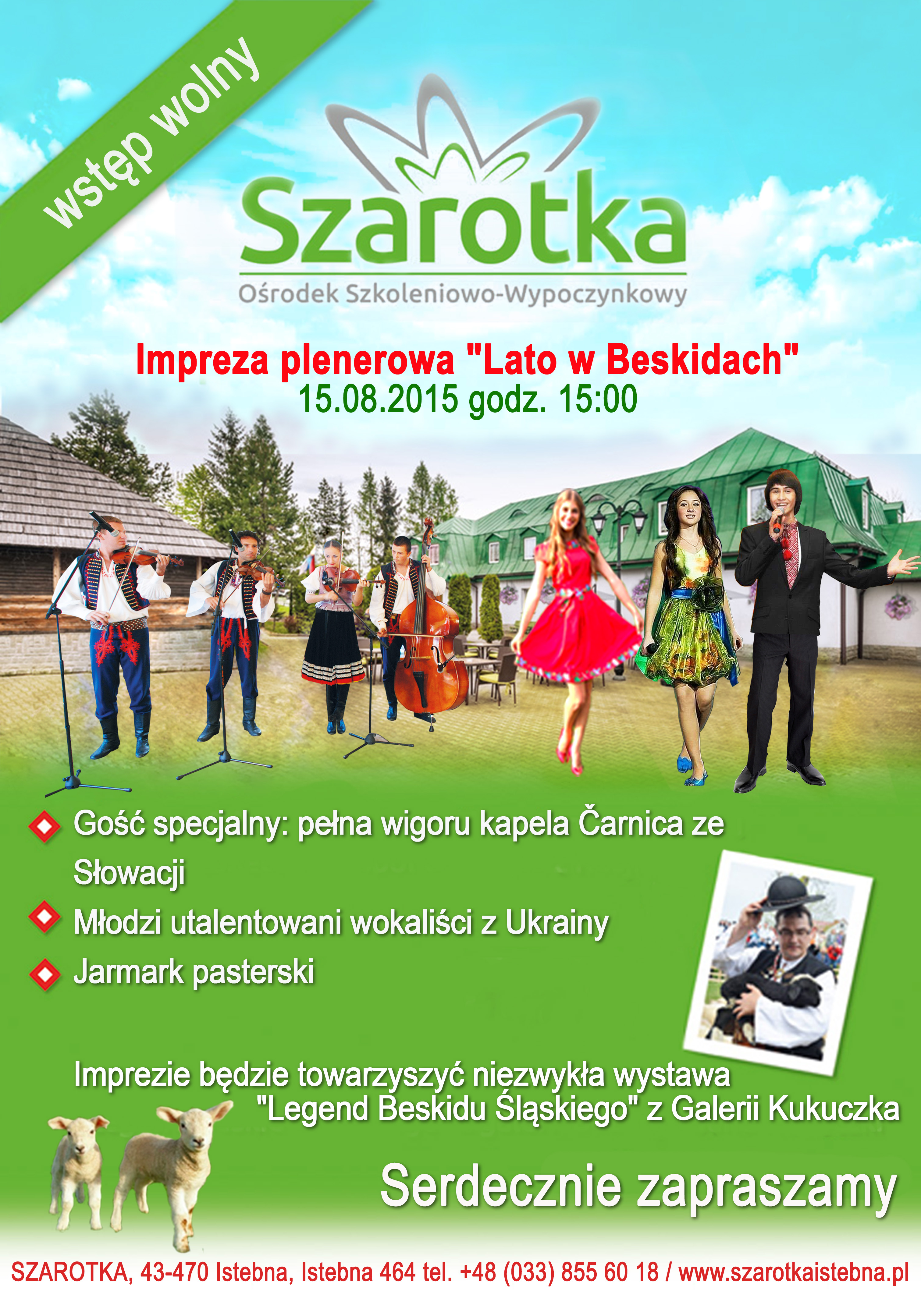 Serdecznie zapraszamy na imprezę plenerową "Lato w Beskidach" organizowaną 15 sierpnia o godzinie 15.00 przy Ośrodku Szkoleniowo-Wypoczynkowym "Szarotka" w Istebnej.