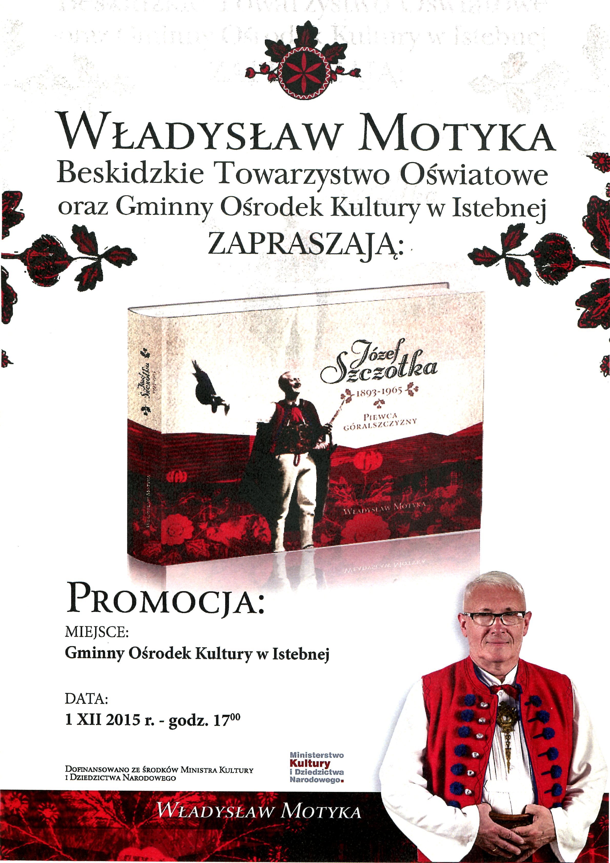 na promocję książki "Józef Szczotka - Piewca Góralszczyzny”, która odbędzie się w siedzibie Gminnego Ośrodka Kultury 1 XII 2015 r. – godz. 17.00.