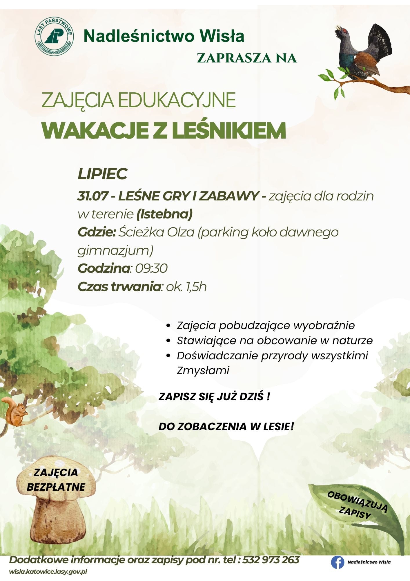 Nadleśnictwo Wisła zaprasza na zajęcia dla rodzin w terenie pt. Leśne Gry i Zabawy, które odbędą się 31 lipca 2025 r.
