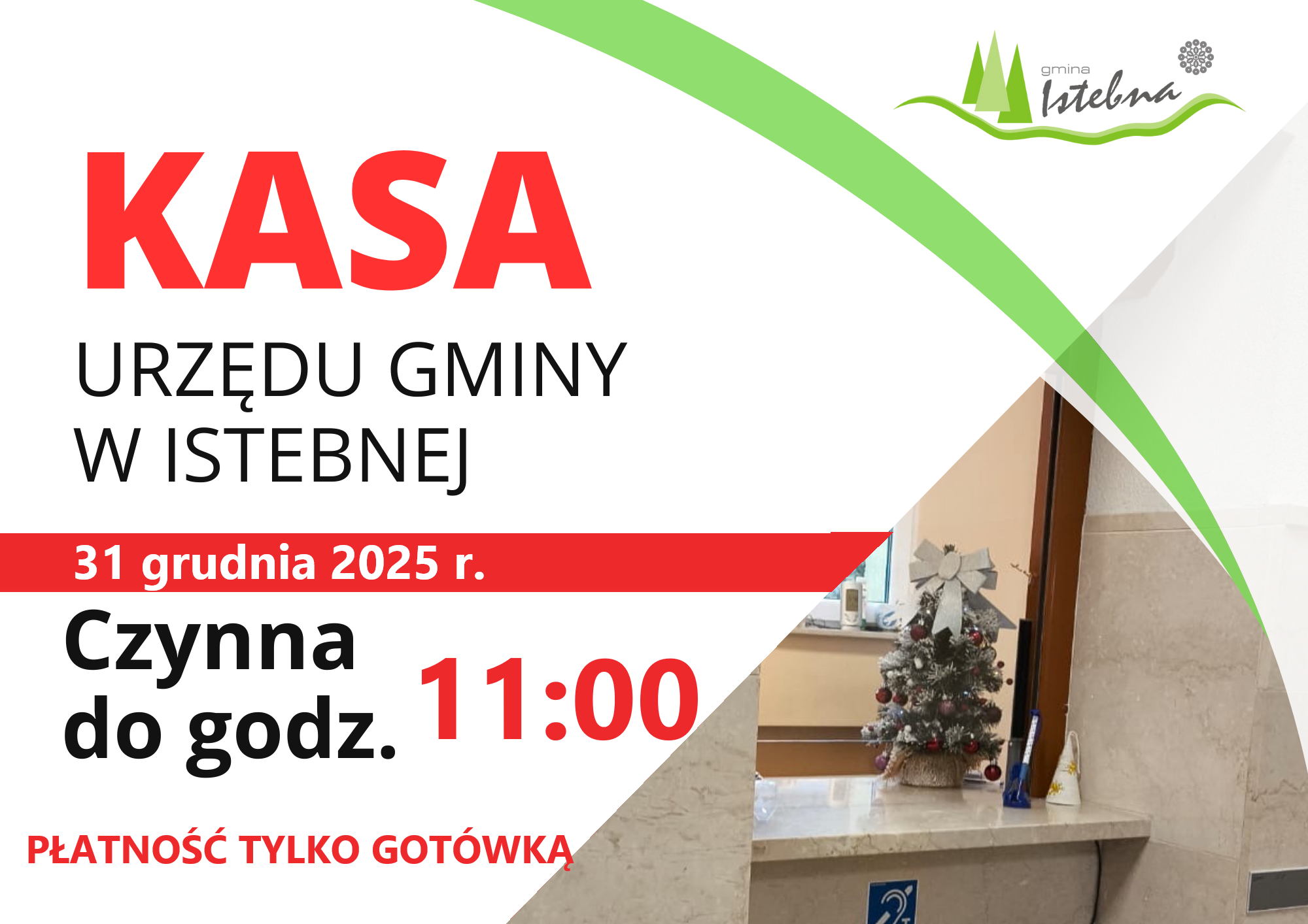 Uprzejmie informujemy, iż w dniu 31 grudnia 2025 r. kasa Urzędu Gminy w Istebnej będzie czynna do godziny 11.00. W tym dniu płatności można dokonać tylko gotówką.